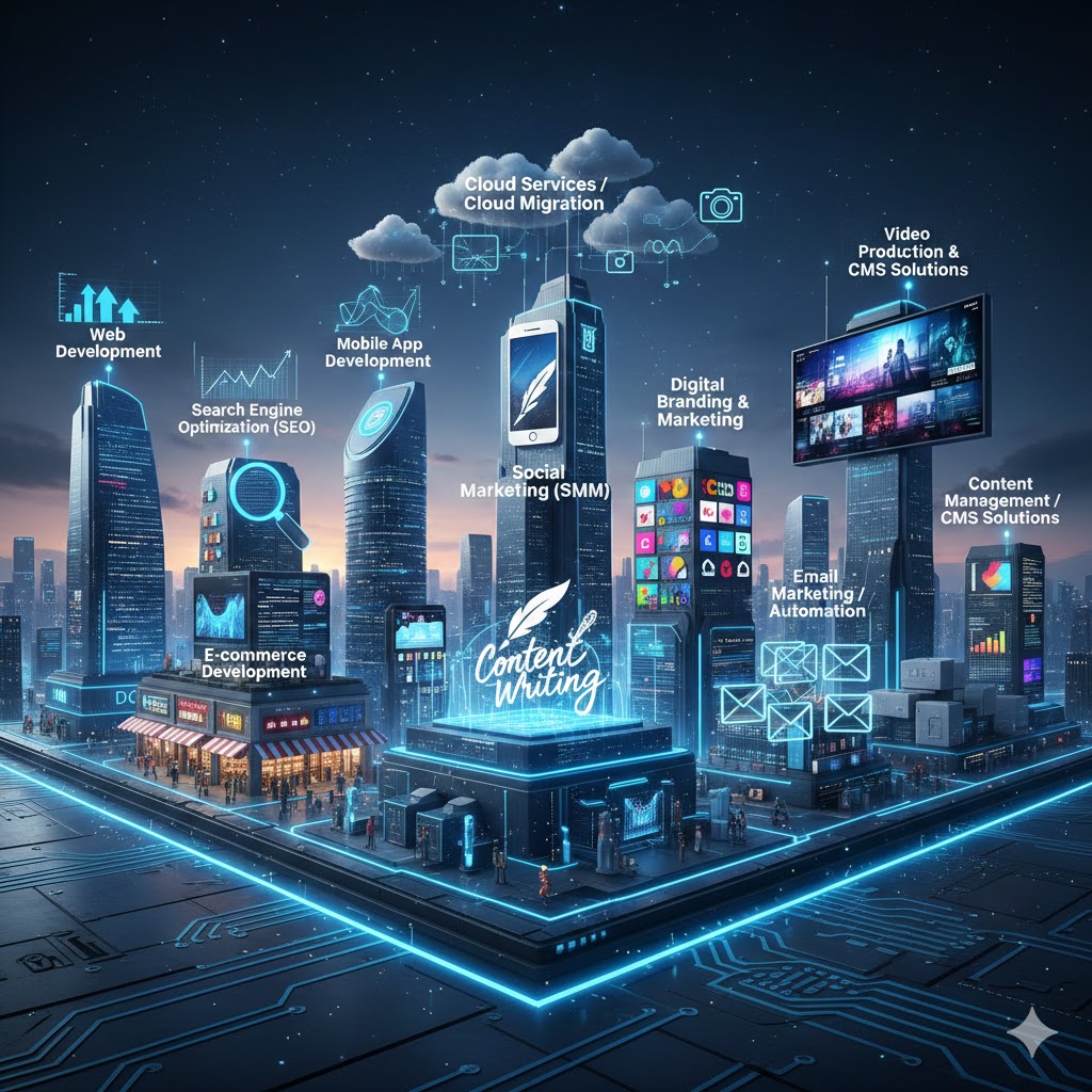 Web Development | Search Engine Optimization (SEM) | E-commerce Development | Search Engine Marketing (SEM) | Content Writing | Mobile App Development | Social Media Marketing (SMM) | Cloud Services / Cloud Migration | UI/UX Design | Digital Branding & Graphic Design | Video Production & Marketing | Email Marketing / Automation | Content Management / CMS Solutions | Data Analytics & Business Intelligence